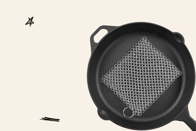 For stuck-on food and even burnt bits, a chainmail cleaner is the smarter option. It’s abrasive but not so much so as to remove your hard-earned seasoning, but you’d still be smart, as we mentioned above, to re-season your pan once you’ve finished cleaning it.