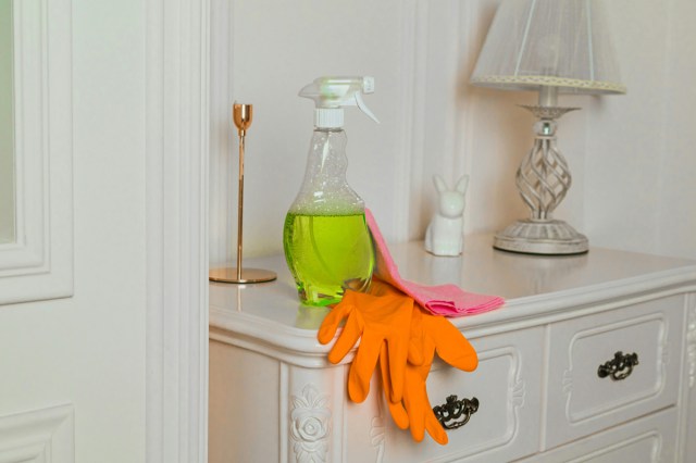 Before scrubbing away on your hands and knees, go room by room and eliminate any obvious clutter. Place dirty laundry in the hamper, put your dog’s toys away, remove anything from your bathroom countertop, and so on. This quick scan of the entire home should only take a few minutes and clears the way for scrubbing and dusting.