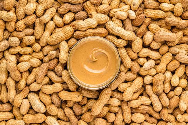 Person putting peanut butter on a hot dog that has ketchup and mustard on it