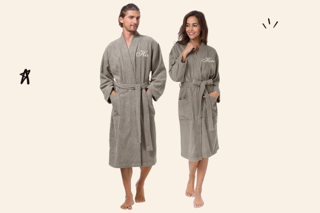 Once you’ve thrown off your LBD and the bow tie’s long been cast aside, you’ll want to step into something a little more comfortable. Enter this couple’s robe set with “His” and “Hers” embroidered on the chest. The 100% cotton weave offers cloud-like softness for cozy couch cuddles.